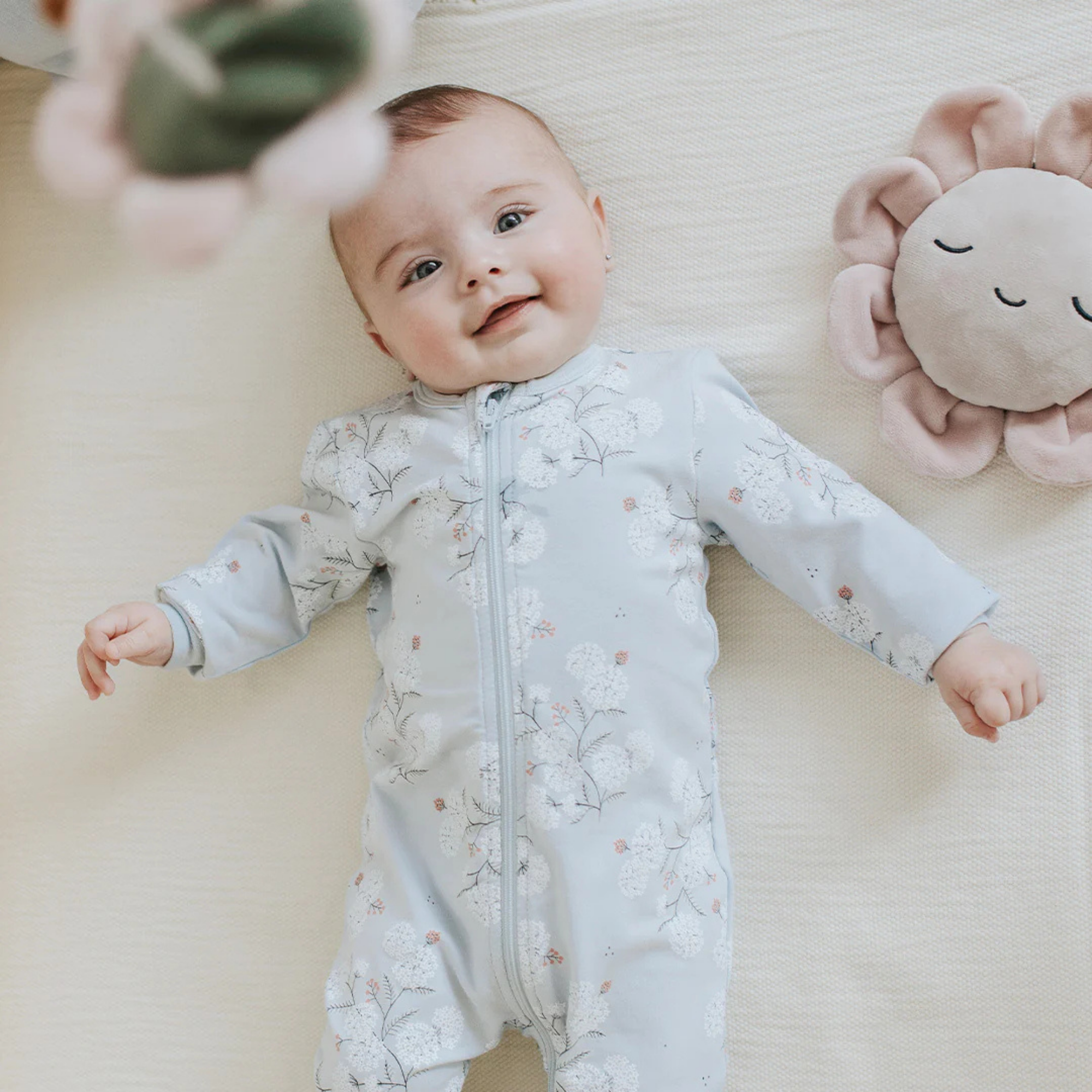 Complete the look and cuddle in comfort—shop the FIRSTS Hydrangea Print on Sky Blue Sleeper now at Kido Bébé and create cozy memories with the whole family!