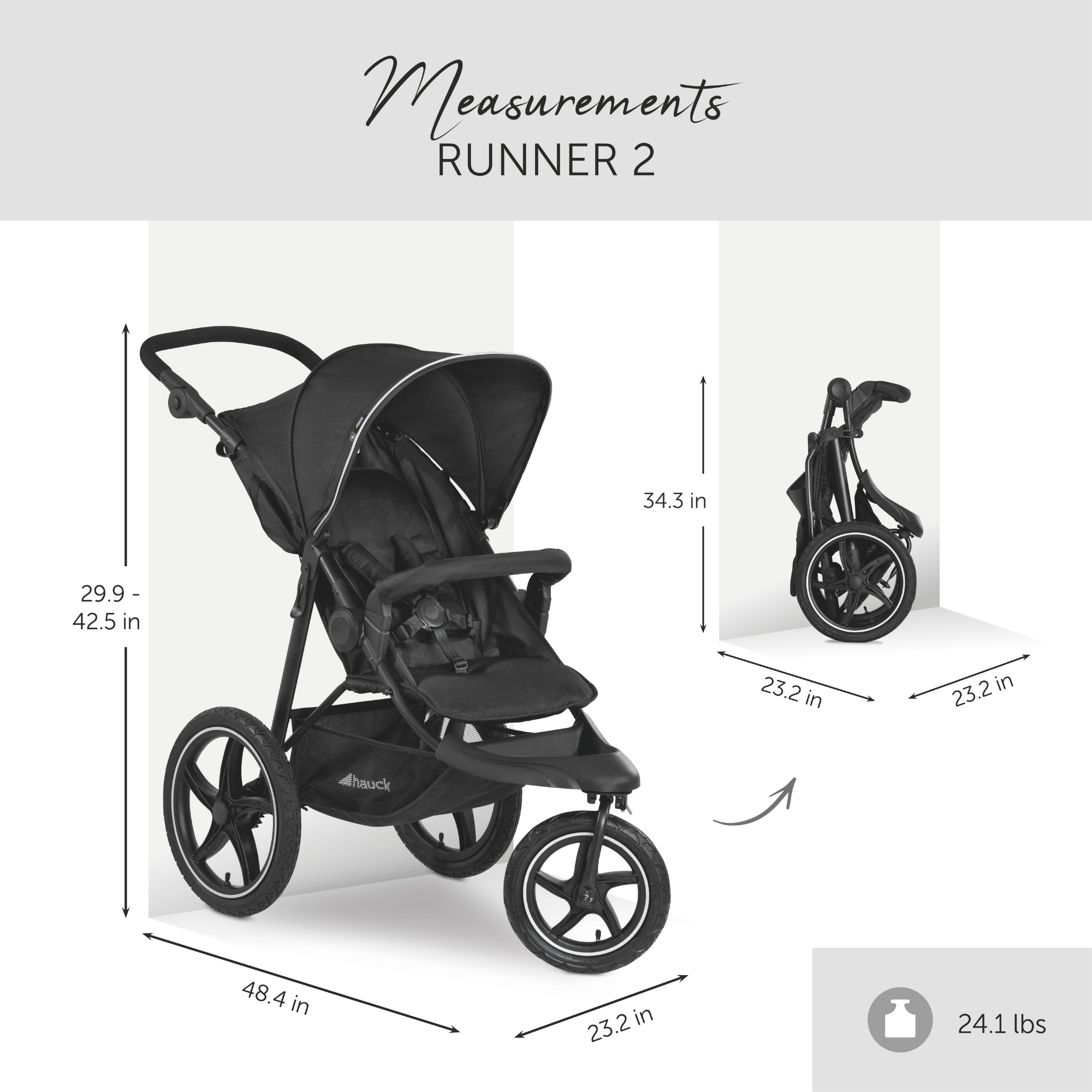XL Pneumatic Wheels for Superior Comfort. Equipped with three large pneumatic wheels including a locking front swivel wheel, the Runner 2 stroller is built to handle almost any terrain with ease. Got a growing child? No problem. The soft, adjustable seat comfortably supports children up to 48.5 lbs., whether sitting upright or reclining for a rest.
