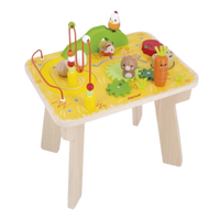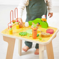 Head for the farm and discover funny animals and vegetables with this multi-activity table, where babies will find all the essentials! Come on, let's introduce your child to new games with this ultra-complete wooden activity table featuring 7 of them: 1 circuit where a spring-loaded chick pushes a wooden ball down a hill, 1 looping bead circuit with 9 sliding wooden beads, 3 gears with 1 removable rabbit, 1 stackable carrot, 1 potato and 1 tomato, 1 maze with another chick running to hide under the hill, and 1 rotating sound egg. With this first-age wooden play table, children aged 12 months and over will go from discovery to discovery in a world they'll love! We love the country-style design of this activity table, with its adorable wood and felt characters to encourage tactile discovery. From the age of one, toddlers begin to explore their environment. They not only manipulate their early-learning toys, but also stand up to see higher and further. A Janod activity table is a playful support that allows baby to move around the table as he pleases, according to his favorite activity of the day! He can sit or stand in front of the table, and off he goes for more discoveries on the farm! The table is 32 cm high. Made from FSC™-certified wood from sustainably-managed forests, this farm activity table invites you to take time for discovery!