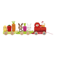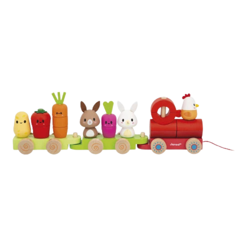 From the farm to the market, the little train takes you around! From 12 months, your baby will love his pull-along train. With 3 wagons and 19 parts to assemble, this wooden train is both a construction game and a pull-along toy that encourages movement. Stack pieces or go for a ride: why choose if you can do both? In the playful, colorful world of the farm, your baby will be delighted to discover little animals (a white rabbit, a brown rabbit and a little hen), as well as fun vegetables (potato, tomato, carrot and radish). Embellished with felt to encourage tactile discovery, the animals and vegetables are to die for! Some characters are made up of a single piece, up to 3 pieces for the carrot and 6 pieces for the locomotive. Their size has been specially designed for little hands. The star skill of this early-learning toy is motor skills! First of all, fine motor skills, thanks to the assembly of the parts and characters, which are all removable. Then, as they get older, they can go on adventures with their wooden train to develop their gross motor skills. There's no doubt about it, the world of the farm has plenty of surprises in store for baby! The wooden train measures 42 x 7 x 14 cm, and the string used to move it is 50 cm long. This first-age toy is made of wood from sustainably managed forests, FSC™ certified. Baby's farm-bound train will enter station track J!