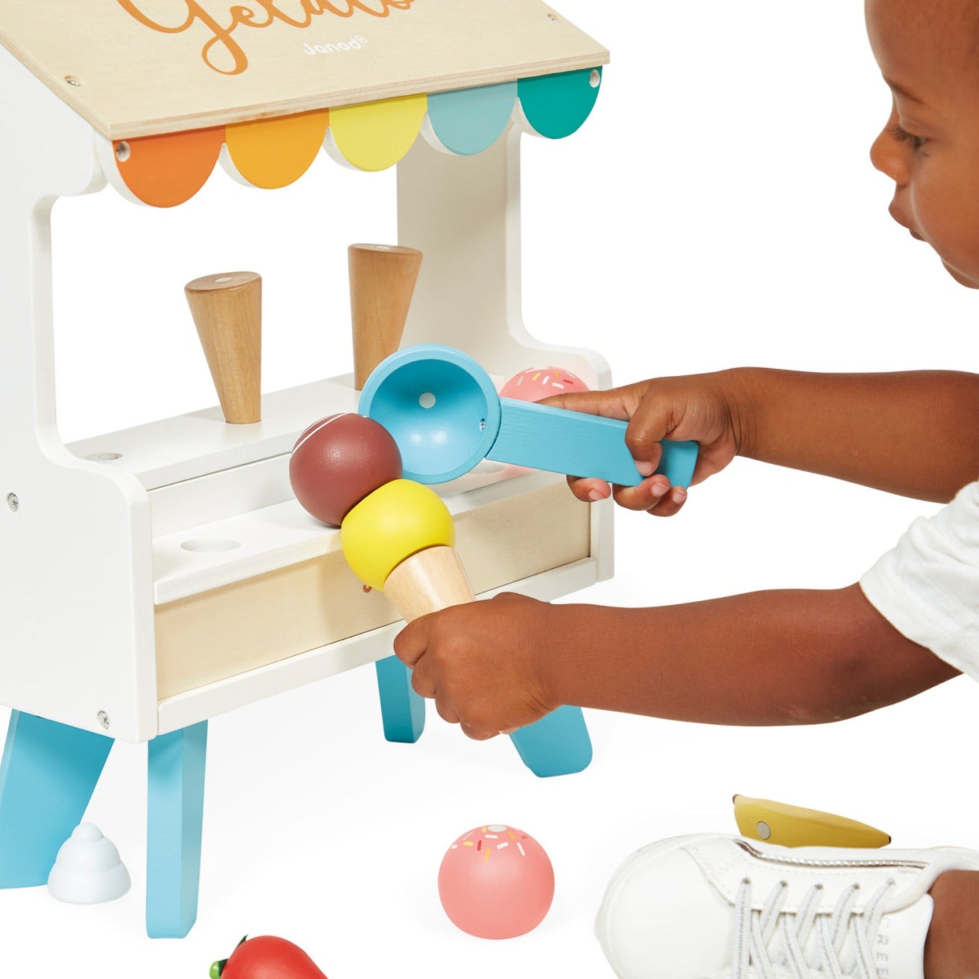 With this wooden stall, little ones can pretend to be ice cream sellers and imitate the adults, which is sure to go down a treat with the whole family! This mini stand can easily be placed on a table and encourages little ones to share: there’s bound to be something for everyone! This food-related pretend play toy also stimulates little ones’ imaginations: what if the strawberry ice cream actually tasted like bubble gum? Children will also need to carefully stack the elements and be creative, to sell the most attractive combinations. All the accessories are provided with the stand and everything is made of FSC® wood.