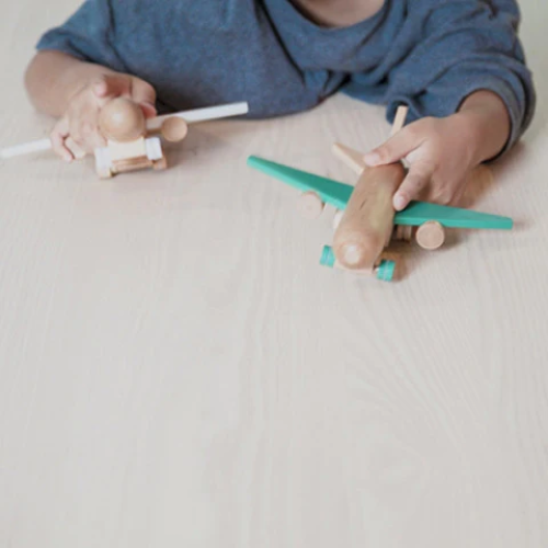 We wanted to bring together the warmth of the wood, the modern look of a jet airplane, and bright colours to paint dreams. The friction engine underneath enables the plane to move on horizontal surfaces to add to the fun!