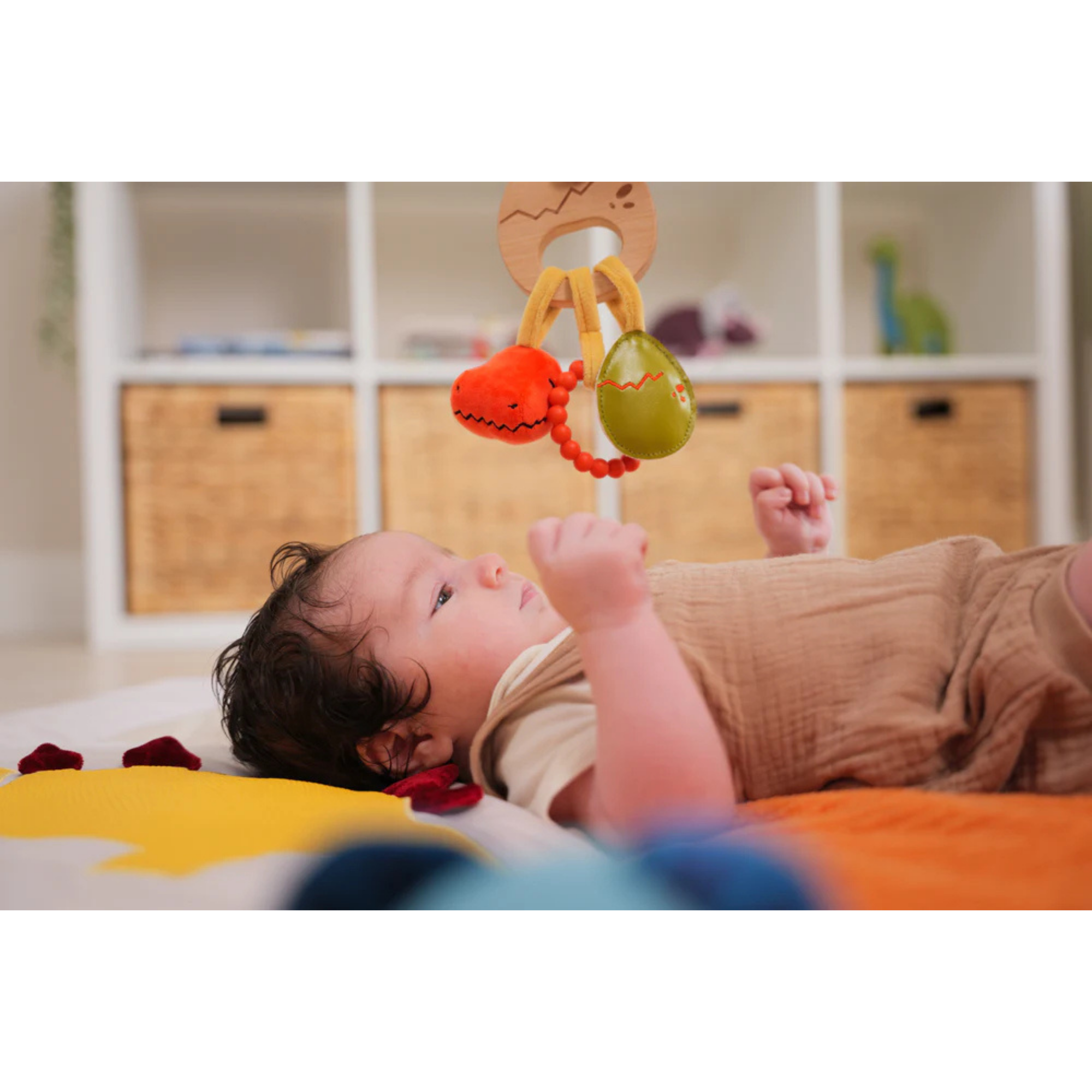 The Wooden Rattle - Dino Friends is an egg-shaped sensory rattle, with three activity toys to stimulate baby's curiosity with different textures and materials. The three cotton cords hold hanging elements to stimulate the senses: a crunchy fabric egg, two colorful rings and a soft little plush of Rex the Tyrannosaurus.