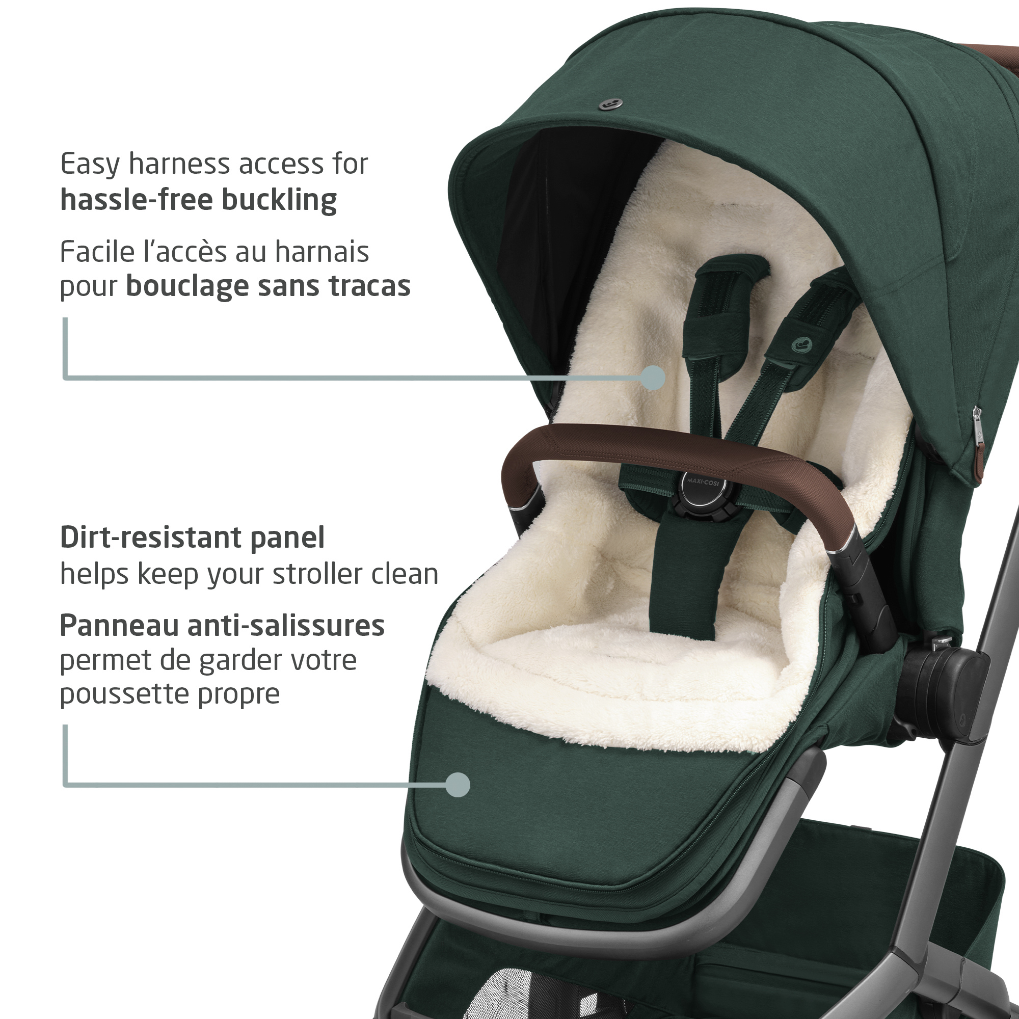 Maxi-Cosi 2-In-1 Footmuff . Cold, wind, rain, or snow—the Maxi-Cosi 2-in-1 Footmuff keeps your baby warm and protected through it all. Designed with a plush teddy fleece interior and a TOG 5 warmth rating, it offers cozy comfort in temperatures as low as -10°C, making it ideal for Canadian winters. The water-resistant exterior and dirt-resistant panel help shield your little one and your stroller from the elements, while the two-way zipper and snap buttons make it easy to adjust for changing weather. Thoughtfully made with 100% recycled Eco Care fabrics, the footmuff is machine washable for everyday convenience. It stays on while folding and fits most Maxi-Cosi strollers, adding a perfect colour match and extra comfort with every ride. Use it as a full footmuff or convert it into a soft seat liner for year-round versatility.