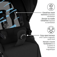 Your little one will enjoy the ultimate ride on ultra-padded HD memory foam. With three recline positions in both forward and rear-facing modes, the Fame ensures optimal comfort whether your child is taking in the world or napping. Its ClimaFlow mesh backrest promotes ventilation and helps regulate temperature on warm days. The 5-point magnetic quick-lock harness simplifies buckling in, giving you effortless convenience every time.