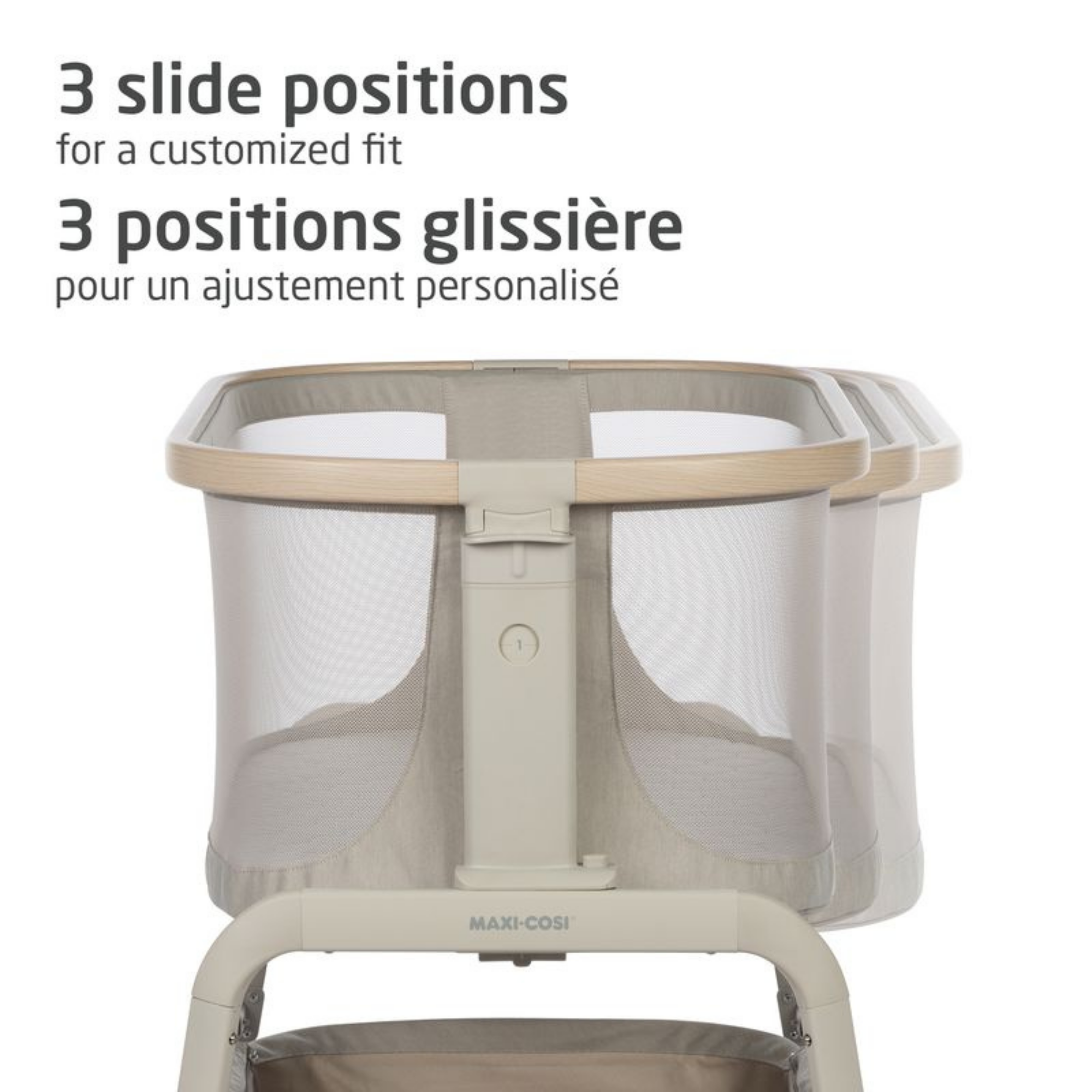 - Easy 3 slide positions for a customized fit. For those moments in the middle of the night when your baby wakes up crying, you can easily glide the bassinet closer to the bed to give comfort and care.
