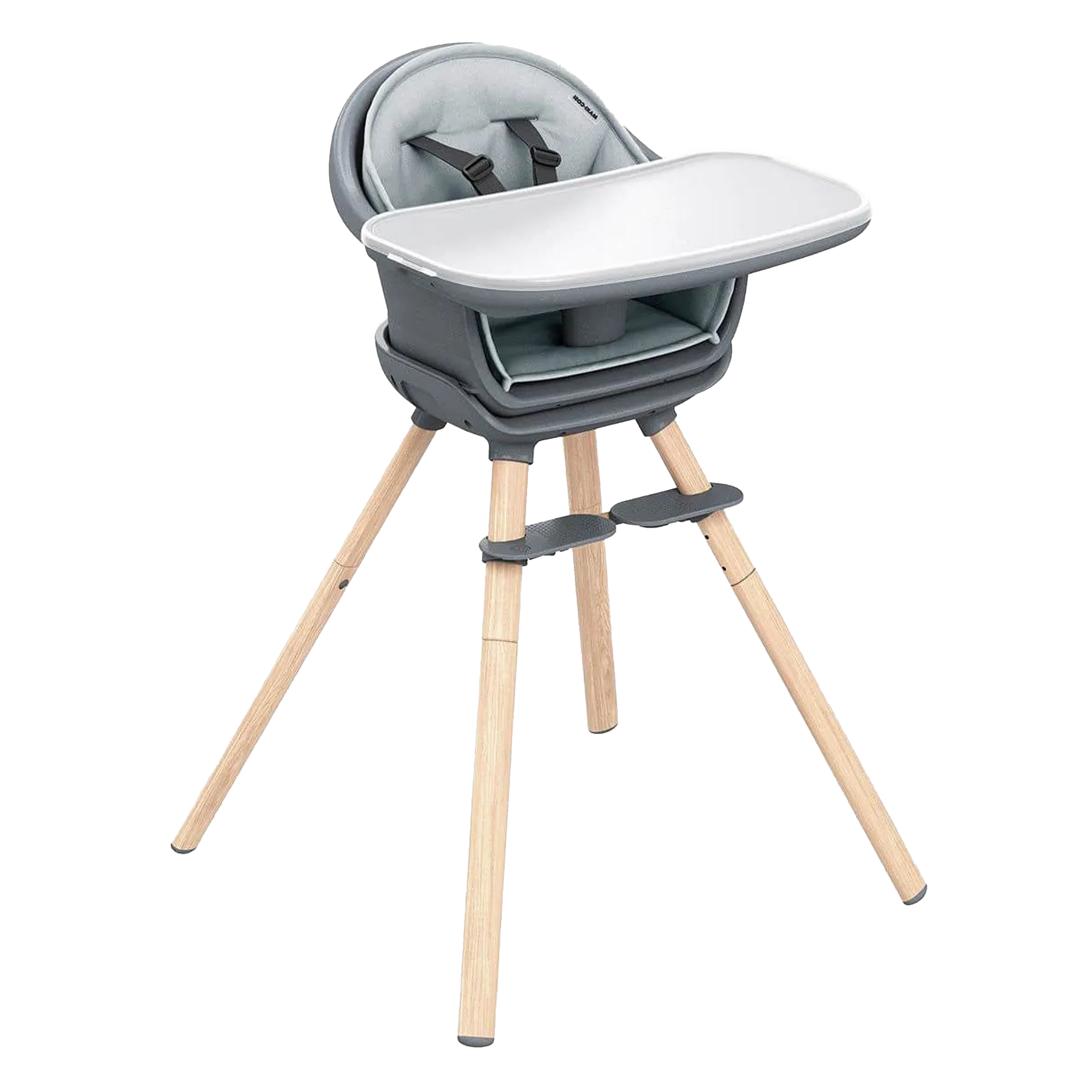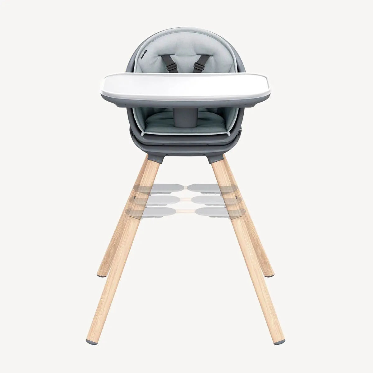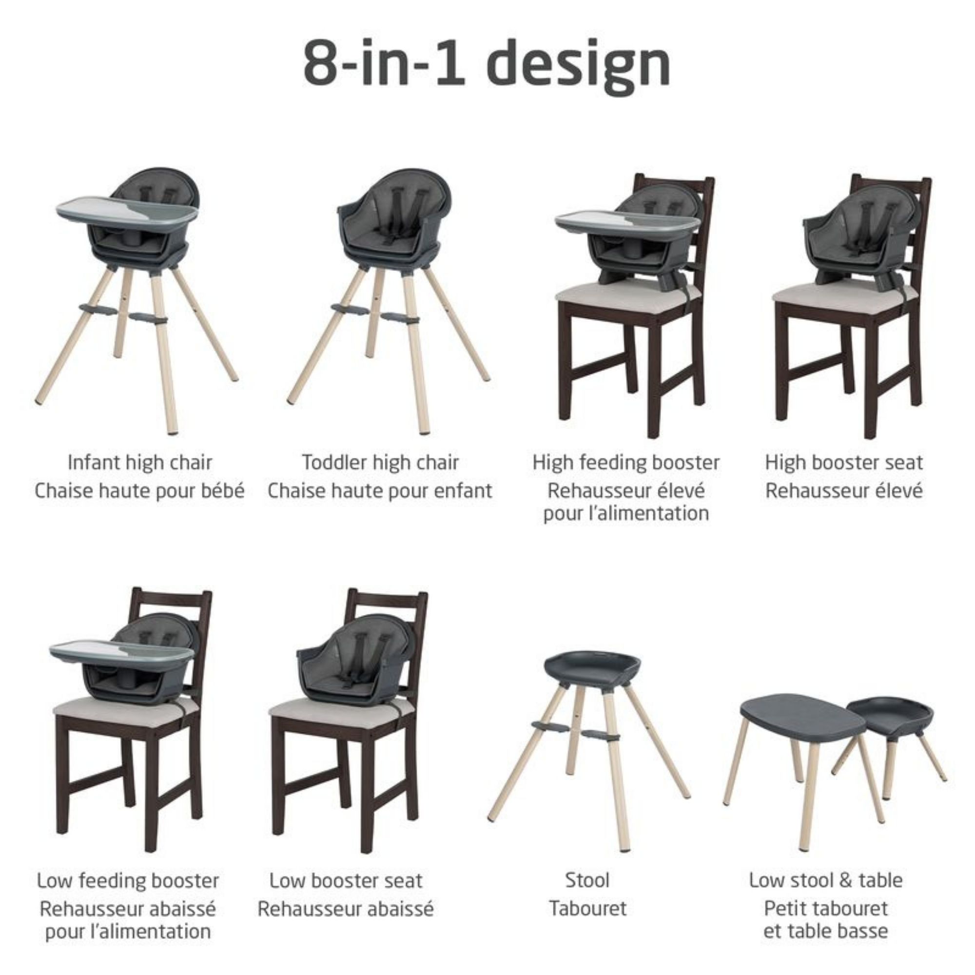 The Maxi-Cosi Moa High Chair is a stylish and smart 8-in-1 seating solution designed to grow with your child from infancy through toddlerhood and beyond. With eight versatile modes of use, the Moa transforms from an infant high chair to a toddler high chair, then into a high feeding booster, booster seat, low feeding booster, low booster seat, and eventually into a low stool and table or standalone stool, providing lasting value for up to six years.