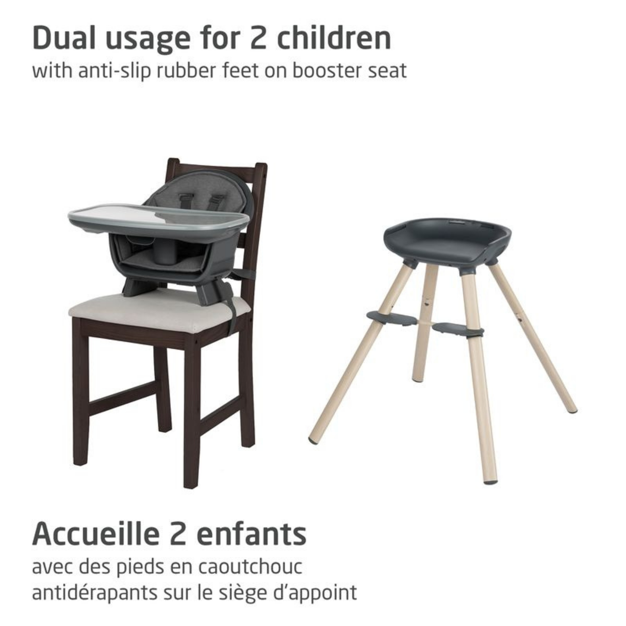 Parents will love the tool-free, easy setup. The Moa’s intuitive assembly system makes it simple to adjust and reconfigure as your child transitions between stages. Anti-slip rubber feet on the booster seat reduce sliding and provide extra stability on different surfaces.