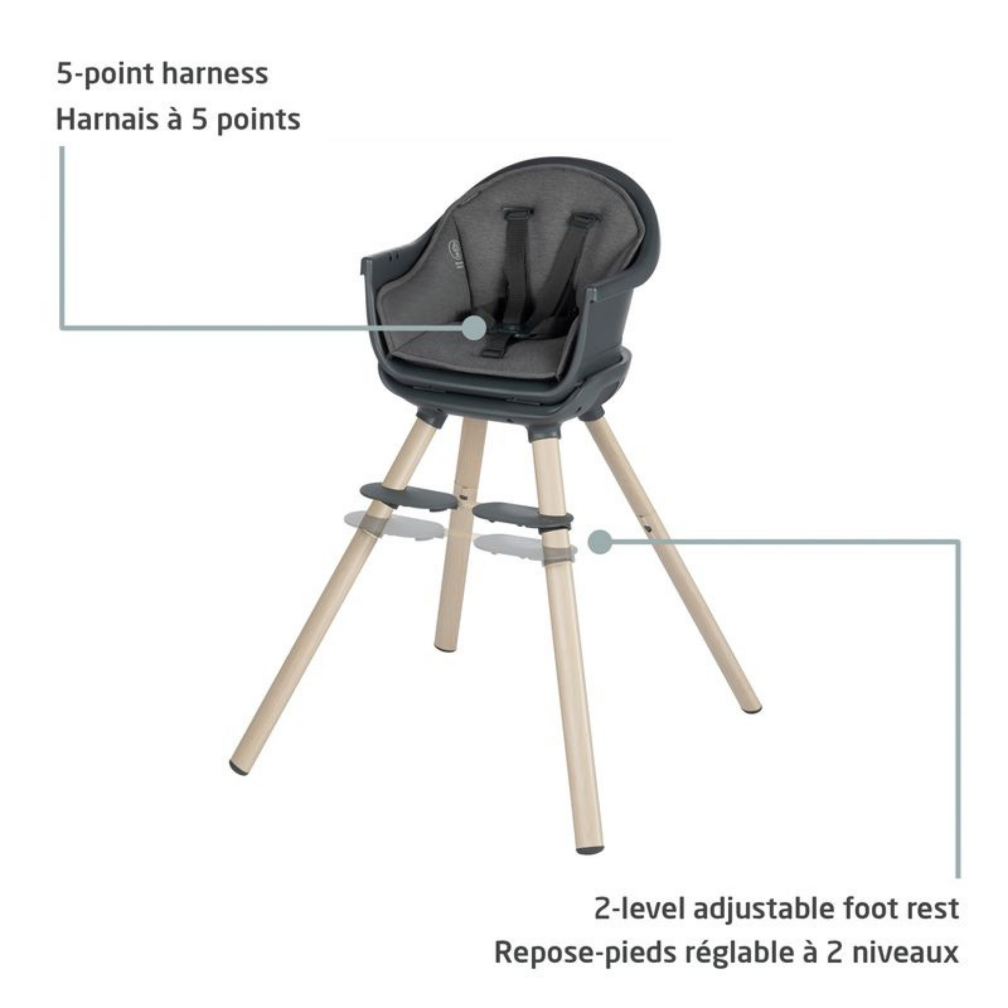 The 5-point safety harness keeps your little one securely seated, giving parents peace of mind during meals and activities. From the first bite of solids to independent table time, the Moa is designed to meet your family’s changing needs.