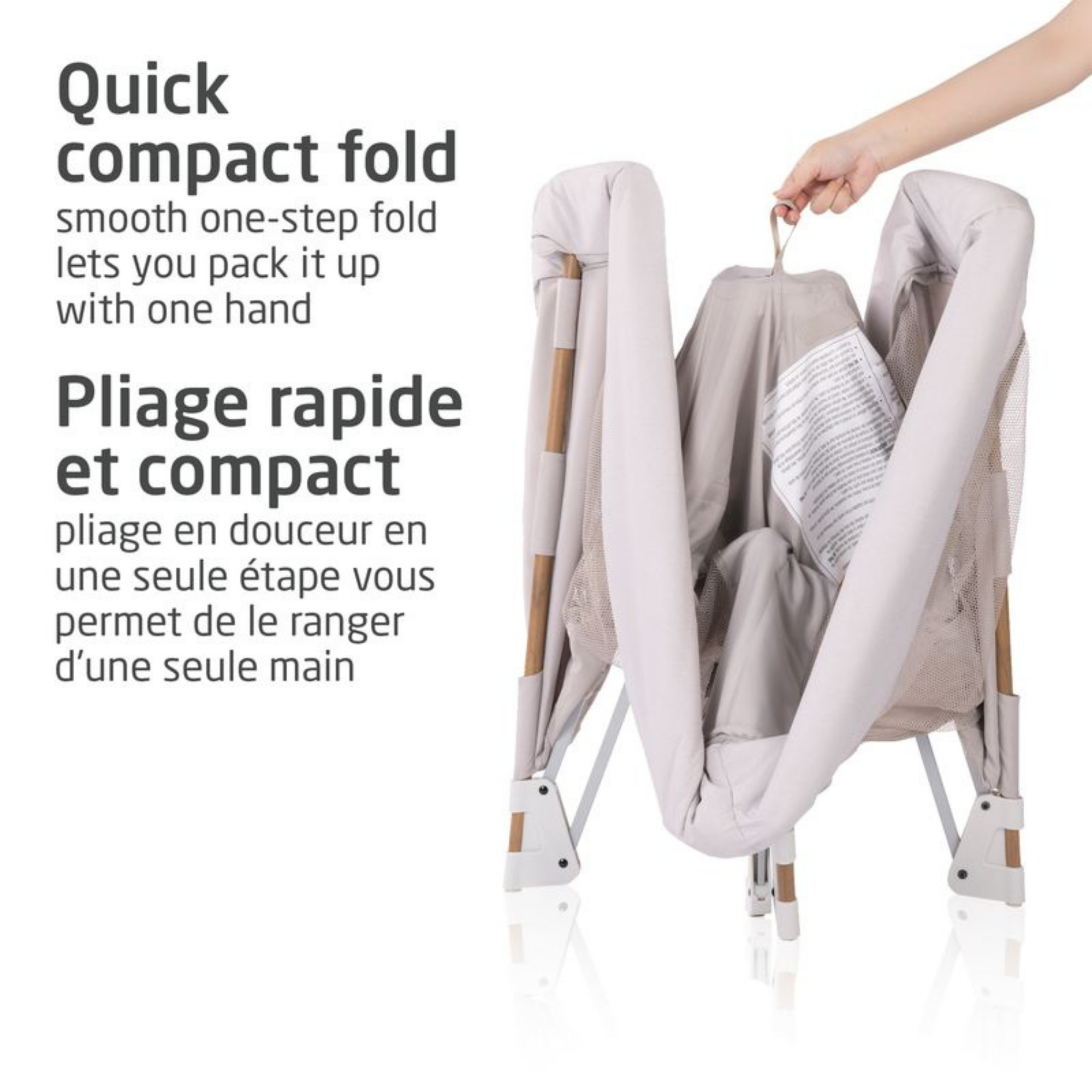 - Everything about Swift is designed for speed and ease of use. Its smooth one-step fold is so quick and easy, you can even do it one-handed. One swift action and you can simply get on with your busy day. Swift grows with your baby from newborn to toddler. So instead of buying three separate portable products (a bassinet, travel nap space (supervised) and play yard), the Swift is all three, stylishly rolled into one.