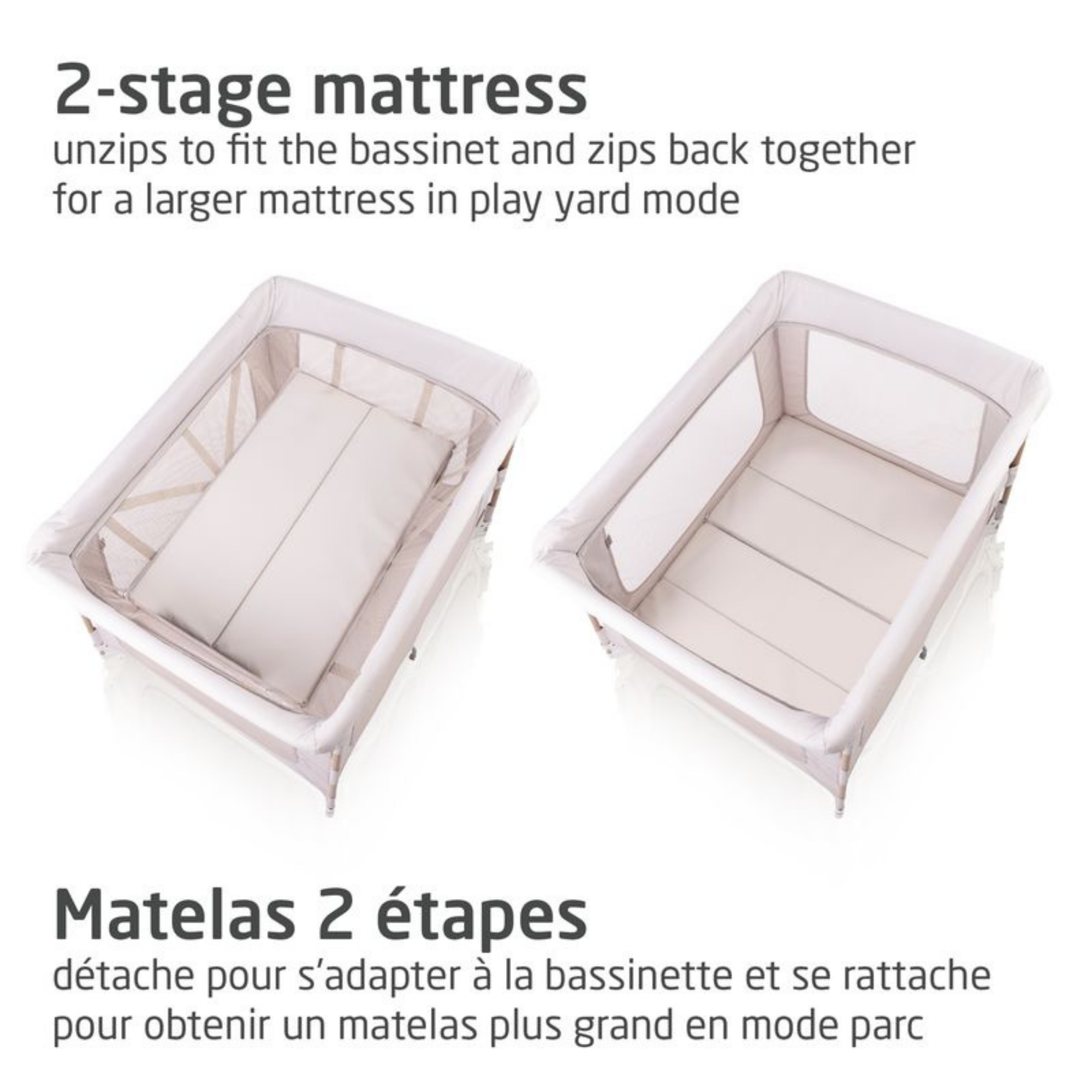 Swift is designed to grow with your little one, offering three uses in one convenient product. The unique 2-stage mattress adjusts as your child grows. For newborns, it provides a snug fit in the bassinet. As your little one transitions to the play yard, the mattress zips into a larger, cushioned space for naps or playtime.