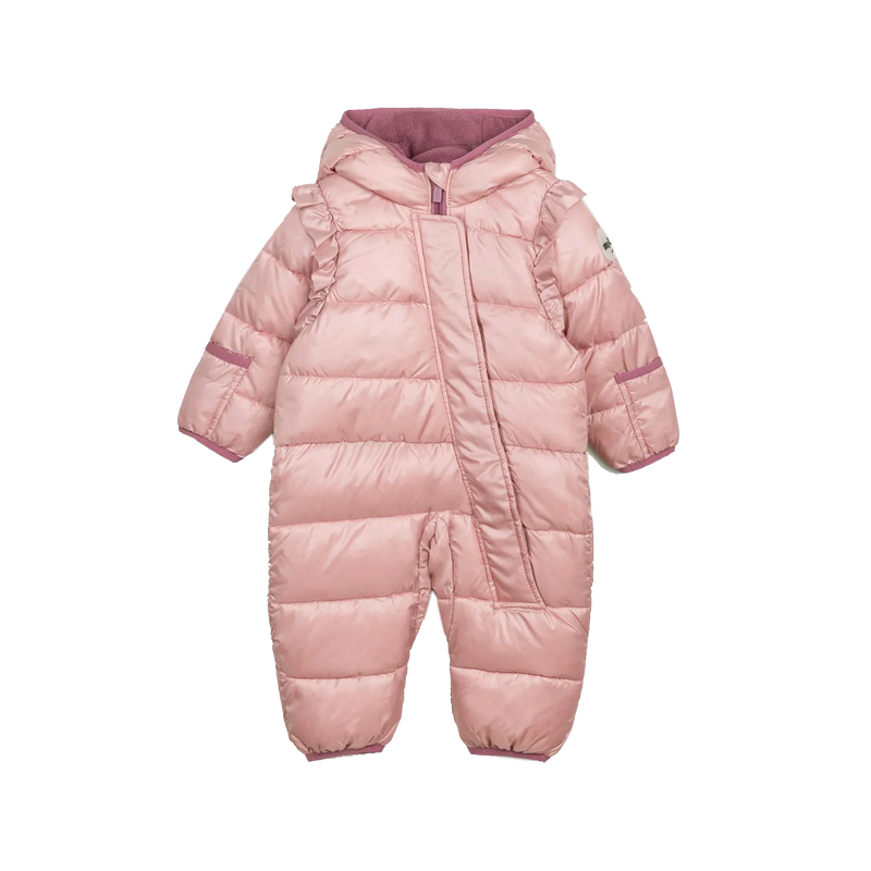 This pink snowsuit is practical and fun to wear. With a ruffle detailing on both shoulders, the piece has a girly style that she’ll love. With a full-length zipper, the snowsuit is easy to put on and take off after a day of playing outdoors. The puffer jacket style one-piece will keep her warm and protect her from the harsh weather. A gentle elastic within the hood helps to keep the hood up while sculpting it around her face to protect little ears from the wind. The suit is finished with a Miles label on one sleeve.