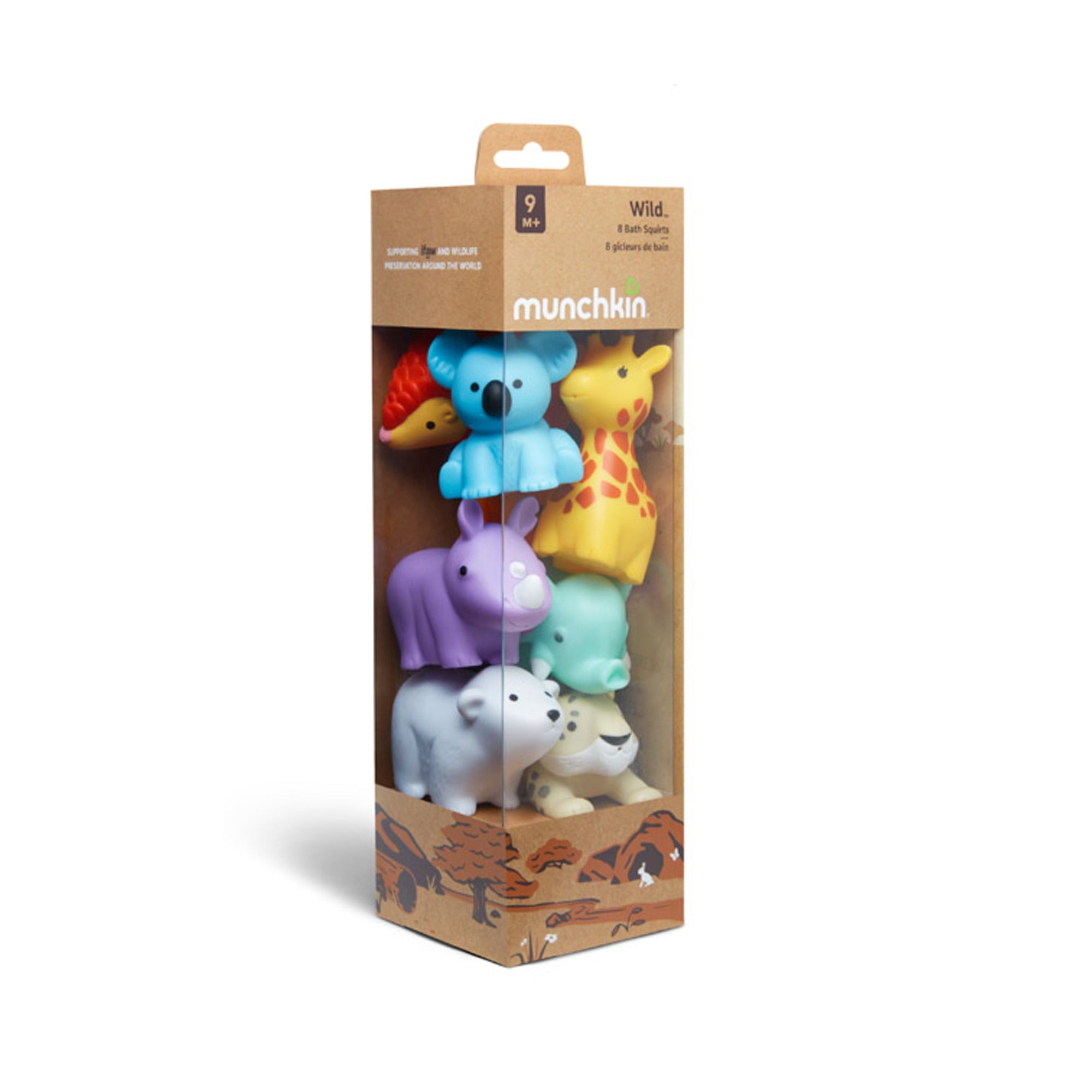 - Bath toy set includes 8 water-squirting, floating wild animal friends