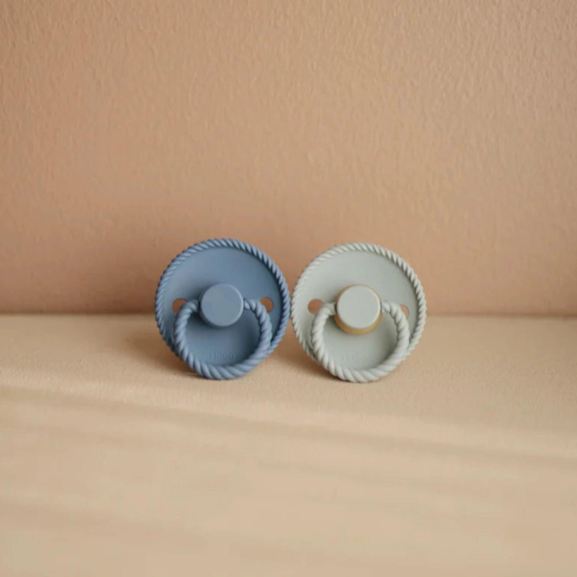 The FRIGG line of rope rubber pacifiers is thoughtfully designed for your baby's comfort and features an entwined rope that surrounds the pacifier shield. The outward curve keeps the pacifier off delicate skin, while air holes and a security handle ensure your baby stays safe. Available in a range of soft colors, FRIGG pacifiers make a beautiful addition to your collection of baby essentials.