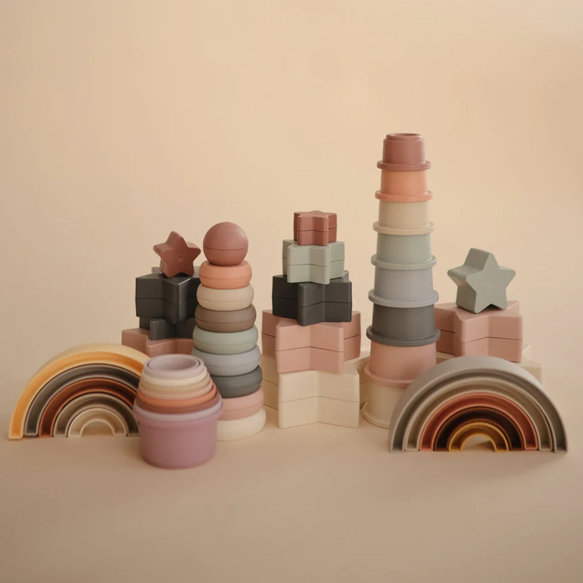 From our Danish hygge collection comes this playful rainbow stacker, inspired by the rainbow skywalk in Aarhus, Denmark. Little ones will sort, stack and play with this beautiful set, all while learning with soft colors and developing their fine motor skills.