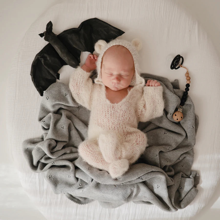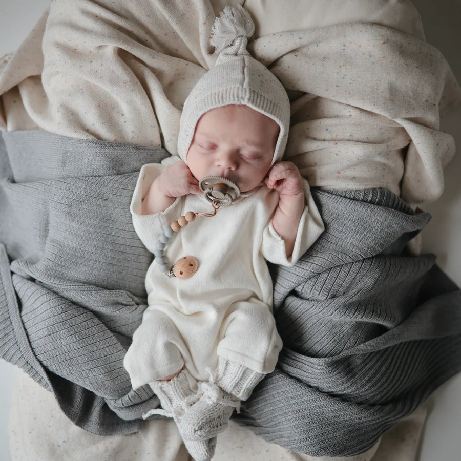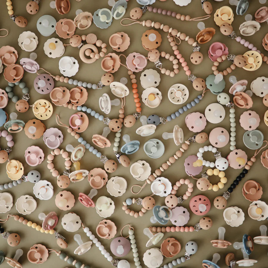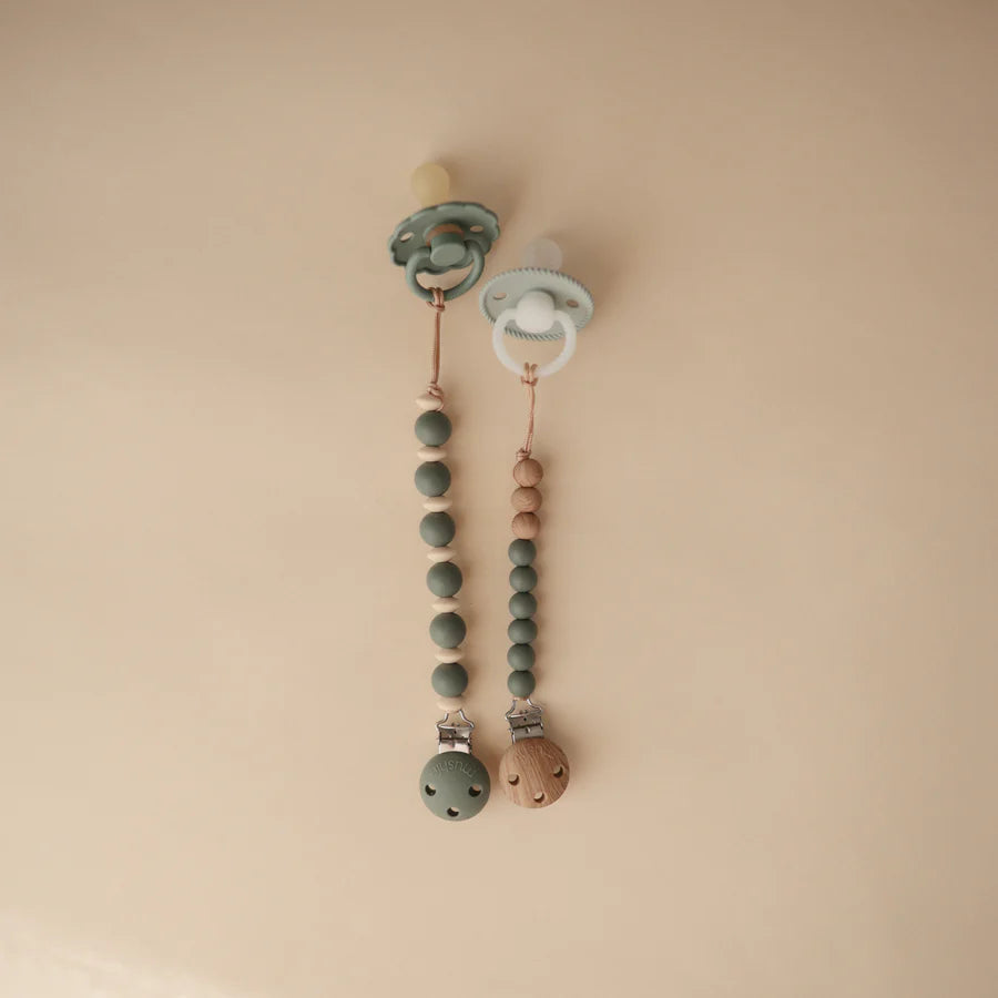 The Mushie silicone pacifier clip offers durability, function and simplicity to families on-the-go. Made from 100% food-grade silicone, our clip features a faux wood silicone clasp that brings a modern take to a traditional favorite. With a simple stack of silicone beads in two complementary colors, the Eva clip offers a sophisticated touch to your pacifier accessories. The clip is easy to clean and helps keep soothing items in reach for little ones.