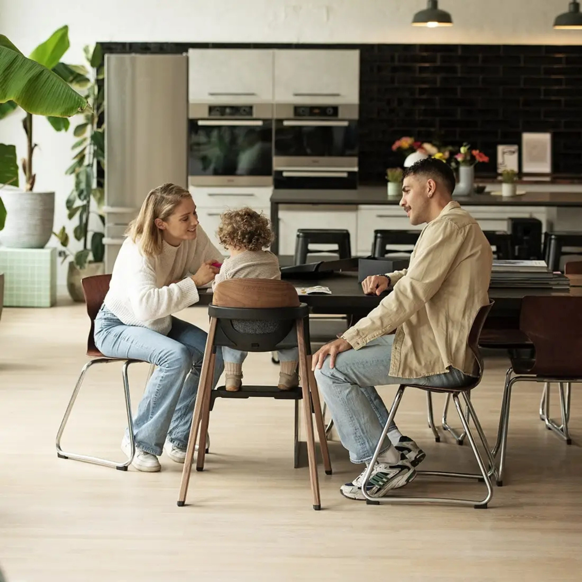 Picture this: sleek lines, warm wood accents, and an intuitive design that not only decorates your dining space with an heirloom furniture appeal but beautifully integrates baby into the heart of your shared family meals.