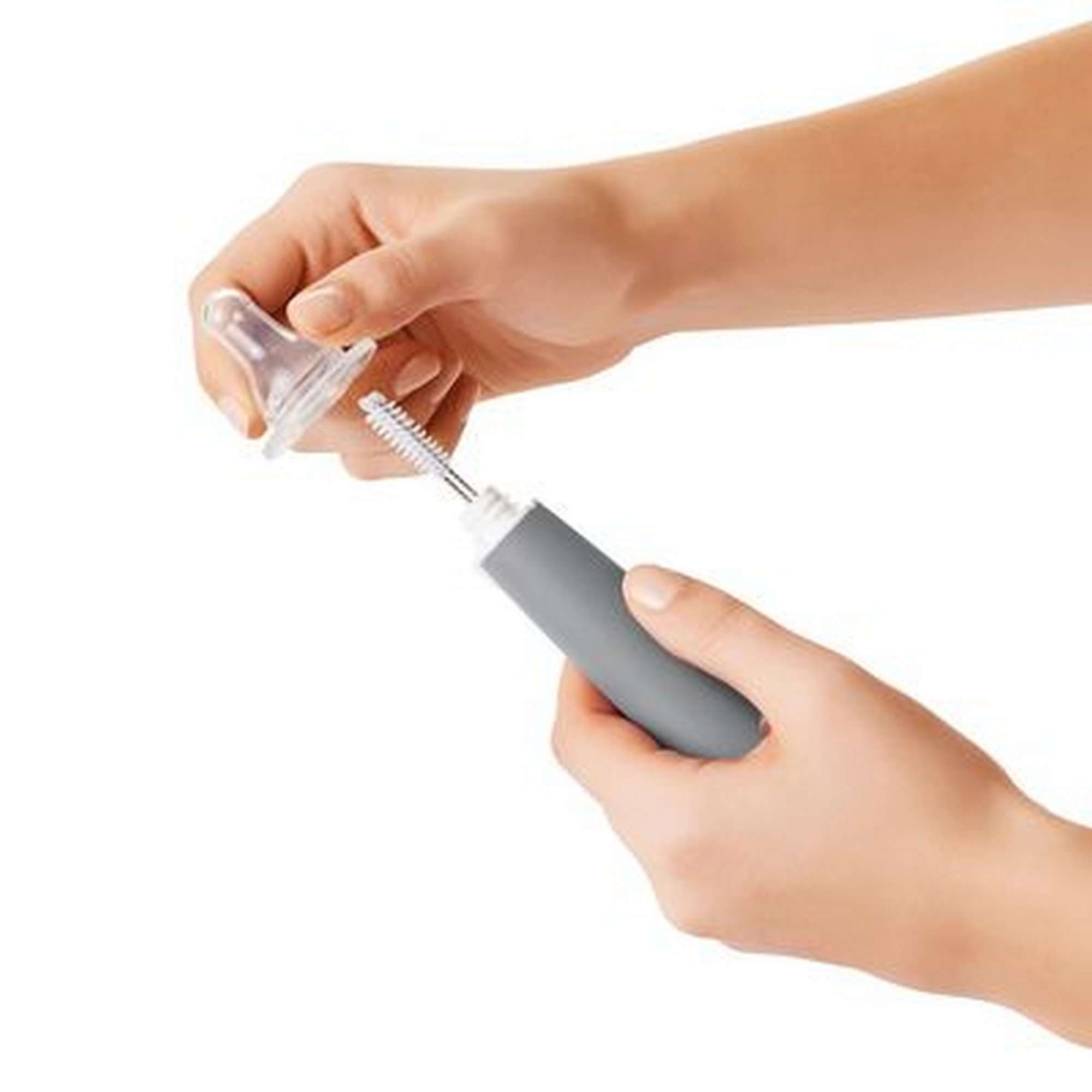 Tucked inside the handle is a silicone Nipple Cleaner that cleans tight spots like bottle nipples and breast pump parts more effectively than bristles can.