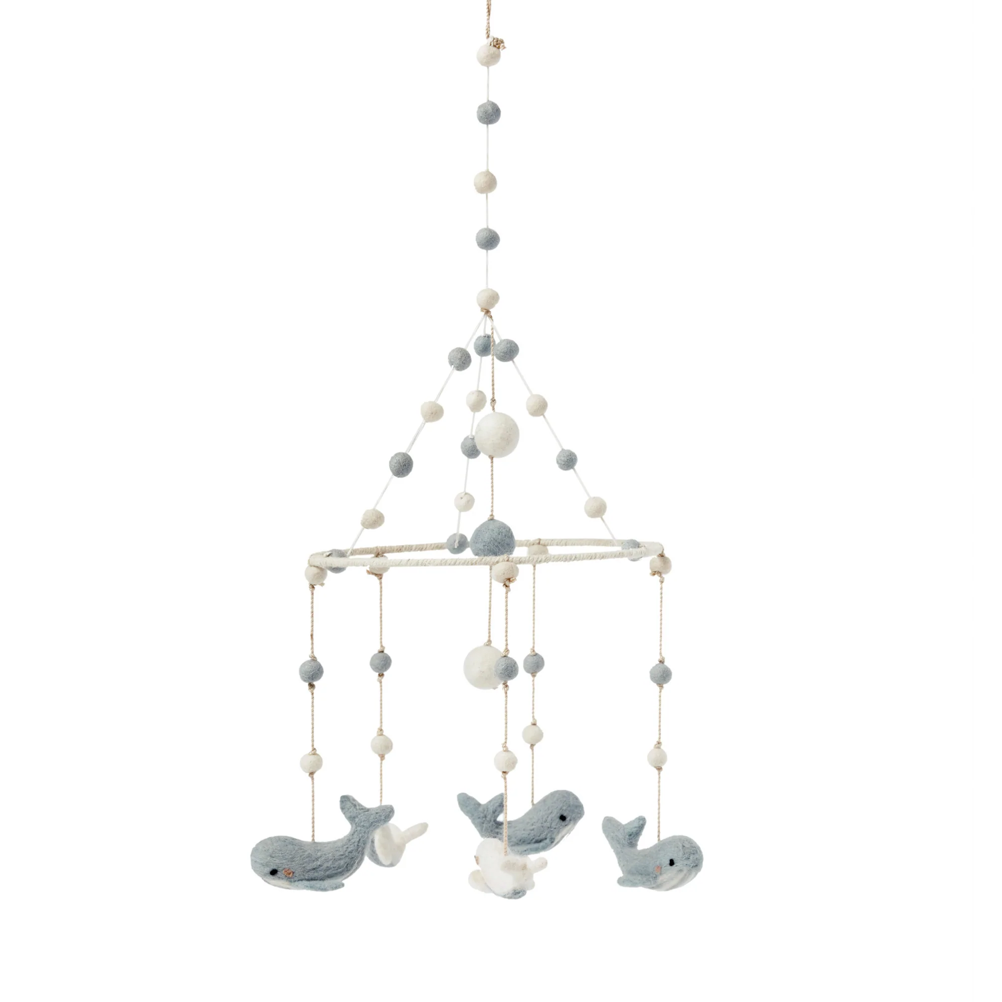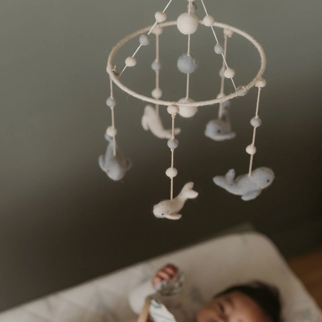 Who can resist these adorable fluffy companions? With pom-poms and five beautiful whales, this mobile is carefully crafted by hand and designed to bring a calming and happy ambience while your baby sleeps.