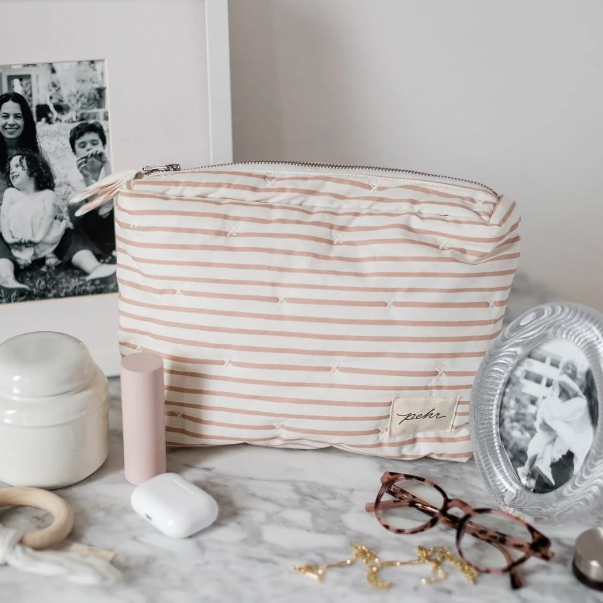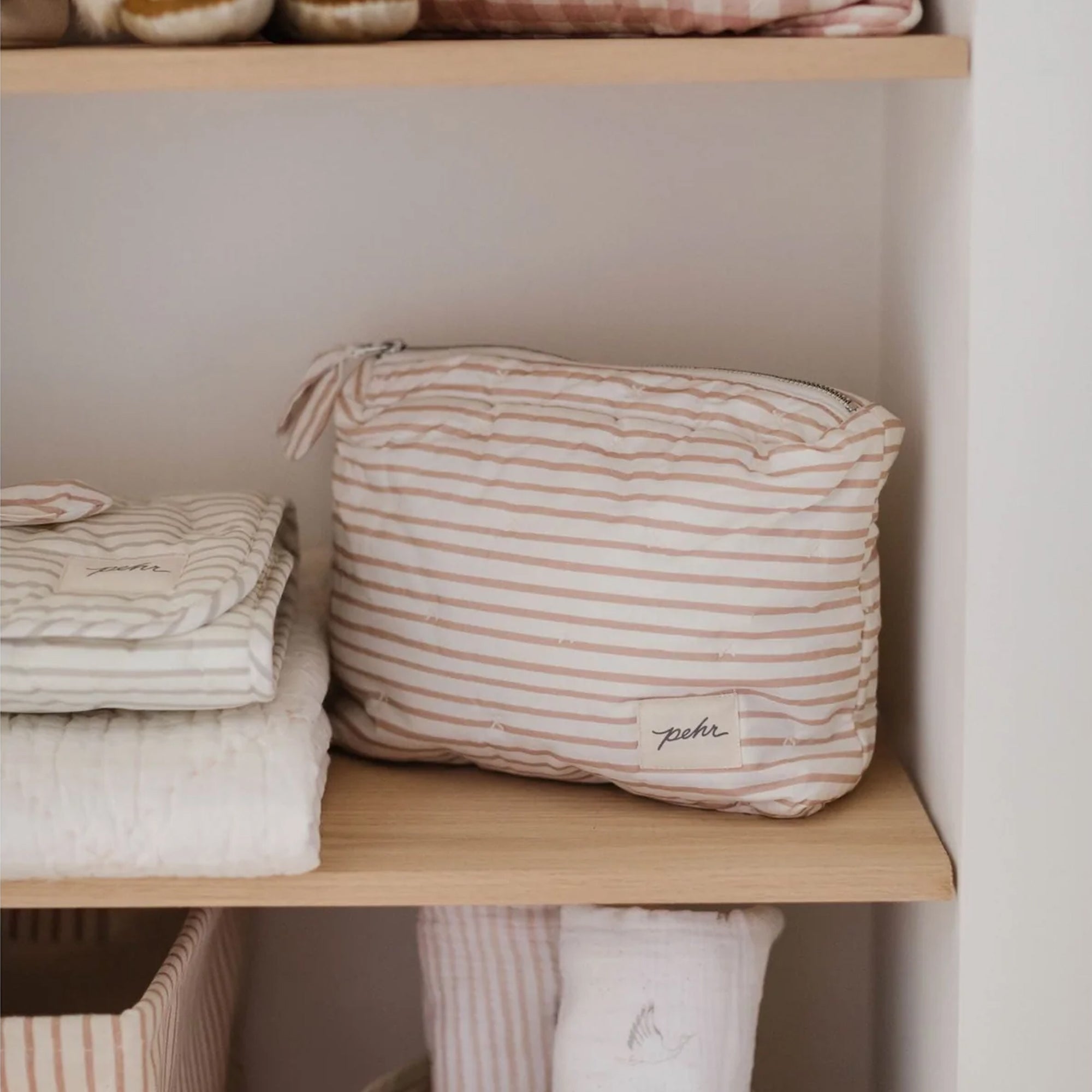 The much-loved On The Go Pouches are designed to make your life easier. This coated organic cotton Pouch is big enough to hold all the essentials. With two interior pockets and a large area for diapers, an extra outfit for baby, a swaddle, burp cloth, bottles, you name it. Or pack it up for a weekend with toiletries or use it yourself Mama! The wipeable exterior and machine wash instructions make it practical as well as cute.
