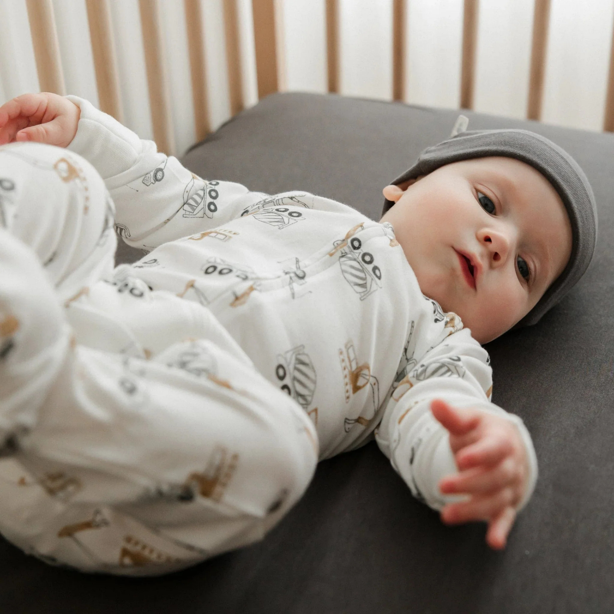 Wrap your little one in comfort with our bamboo baby sleeper, featuring delightful construction-themed prints. This charming sleeper is crafted from a breathable blend of bamboo viscose and cotton, perfect for sensitive skin. The soft floral pattern adds a touch of nature’s beauty to your baby's wardrobe. Designed with a convenient zipper for easy diaper changes and fold-over mitts for extra protection, it’s a thoughtful choice for new parents. Designed in Canada, this sleeper seamlessly blends style, comfort, and functionality, ensuring your baby stays cozy through every season.