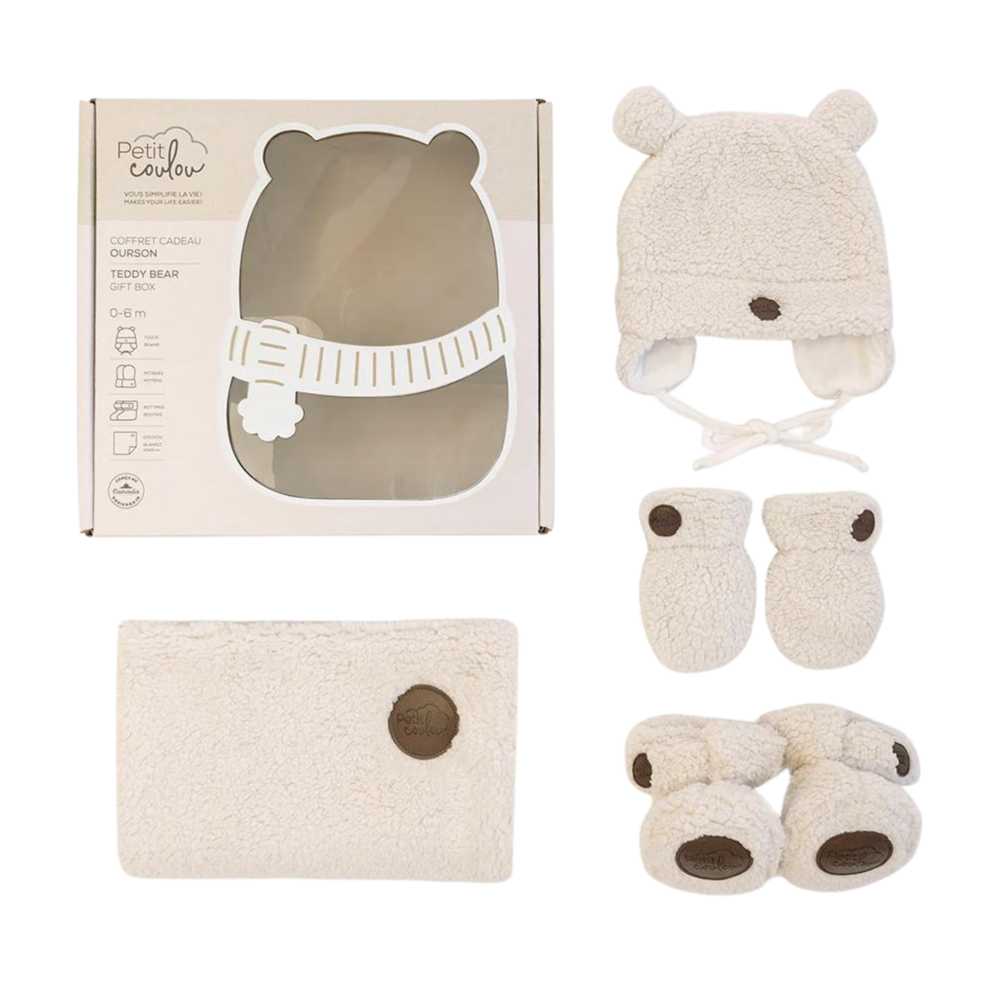 Wrap your little one in comfort and warmth with our adorable PETIT COULOU Teddy Bear Gift Box! Perfect for any season, this set features soft booties, a teddy bear beanie with playful ears, cozy mittens, and a fluffy blanket. Ideal for gifts or personal use, it's a must-have for every mom. Shop now and give the gift of warmth and style with Kido Bébé!"