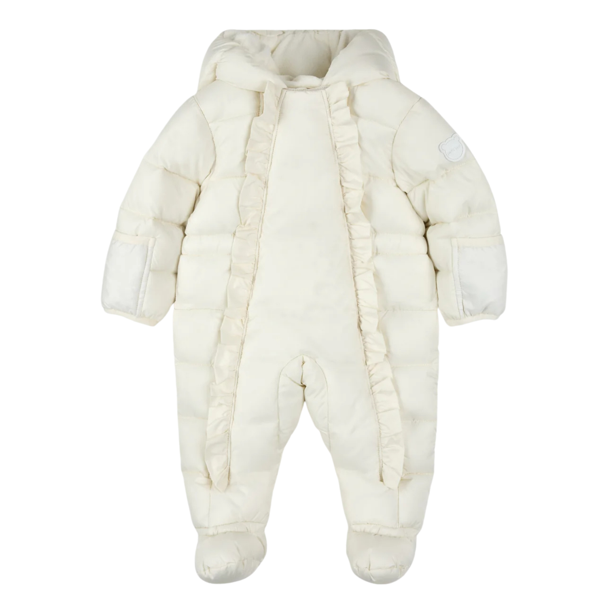 Brave chilly days in style with your little one in tow. Made entirely from recycled materials, our sustainable snow capsule is wind-resistant, water-repellent and designed to withstand the cold, keeping them snug and happy while experiencing their first snow. The polar fleece lining and face-hugging hood provide extra coziness and keeps out the elements while the frilly zip detailing adds a sweet touch. Sizes 3 months to 9 months have integrated booties while sizes 12-24m have elastic at the ankles.
