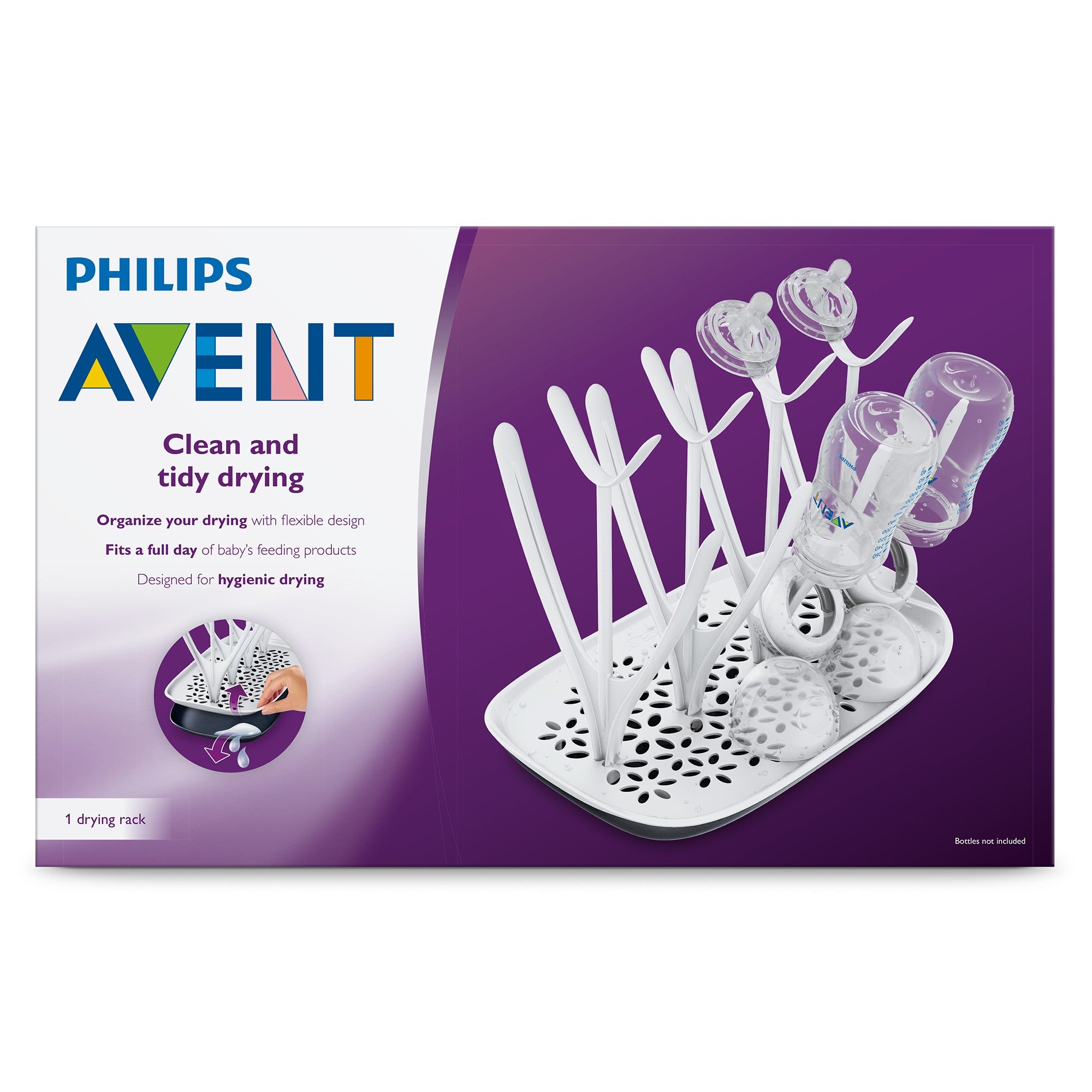 The Philips Avent drying rack is designed to dry your baby's bottles and accessories in the most clean and tidy way. With a flexible design, a detachable drip try and room to hold any bottle size, it is answering your daily drying needs.