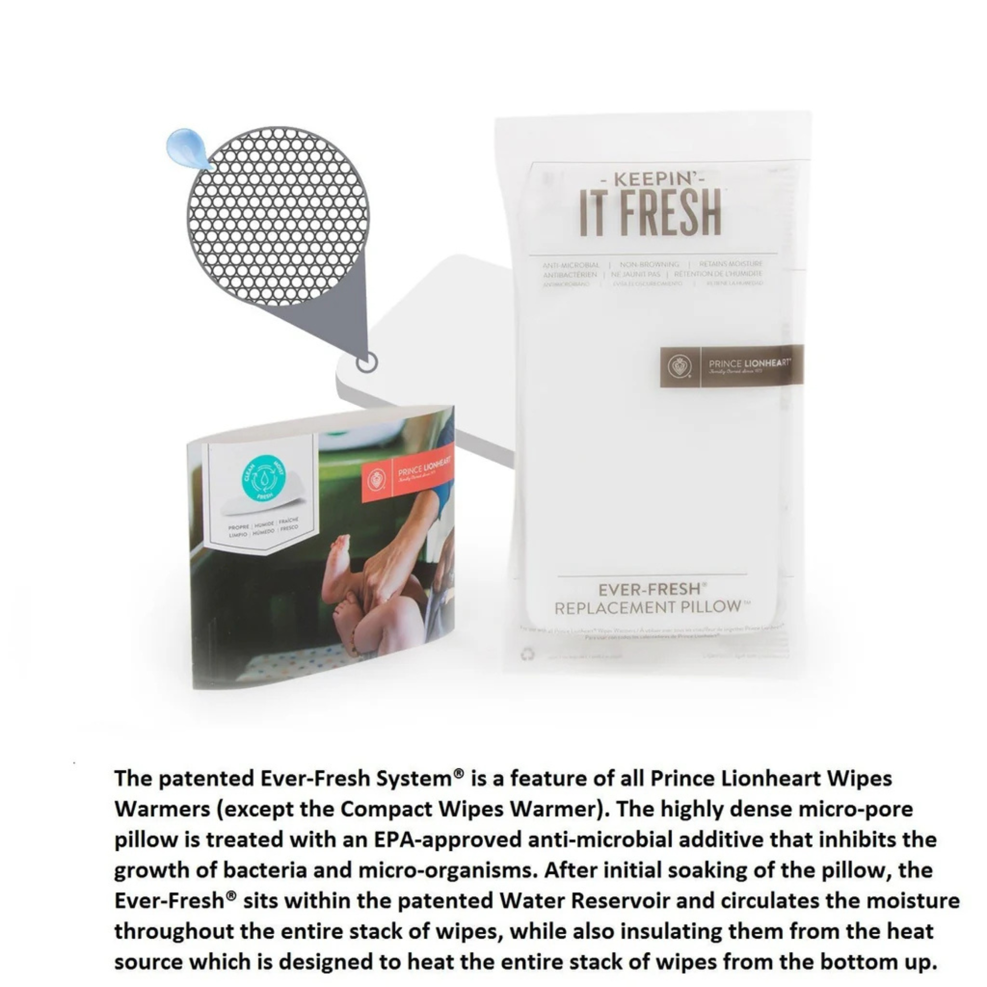 Specially designed to accompany the Prince Lionheart Wipes Warmer (sold saparately ) of your choice, the Ever-Fresh® Pillow will help keep your wipes moist longer than ever. Simply place your saturated Ever-Fresh Pillow at the bottom of your baby wipes warmer. The pillow helps keep the wipes moist and fresh, fighting off bacteria with the EPA-approved anti-microbial additive within the Ever-Fresh Pillow, all while preventing the bottom of your wipes warmer from browning. By the way, browning is normal and expected. It is not burning. It is the result of the oxidation process when wipes with various additives are warmed, similar to an apple that oxidizes and turns brown once it is cut; it is safe to eat, just a little unsightly.