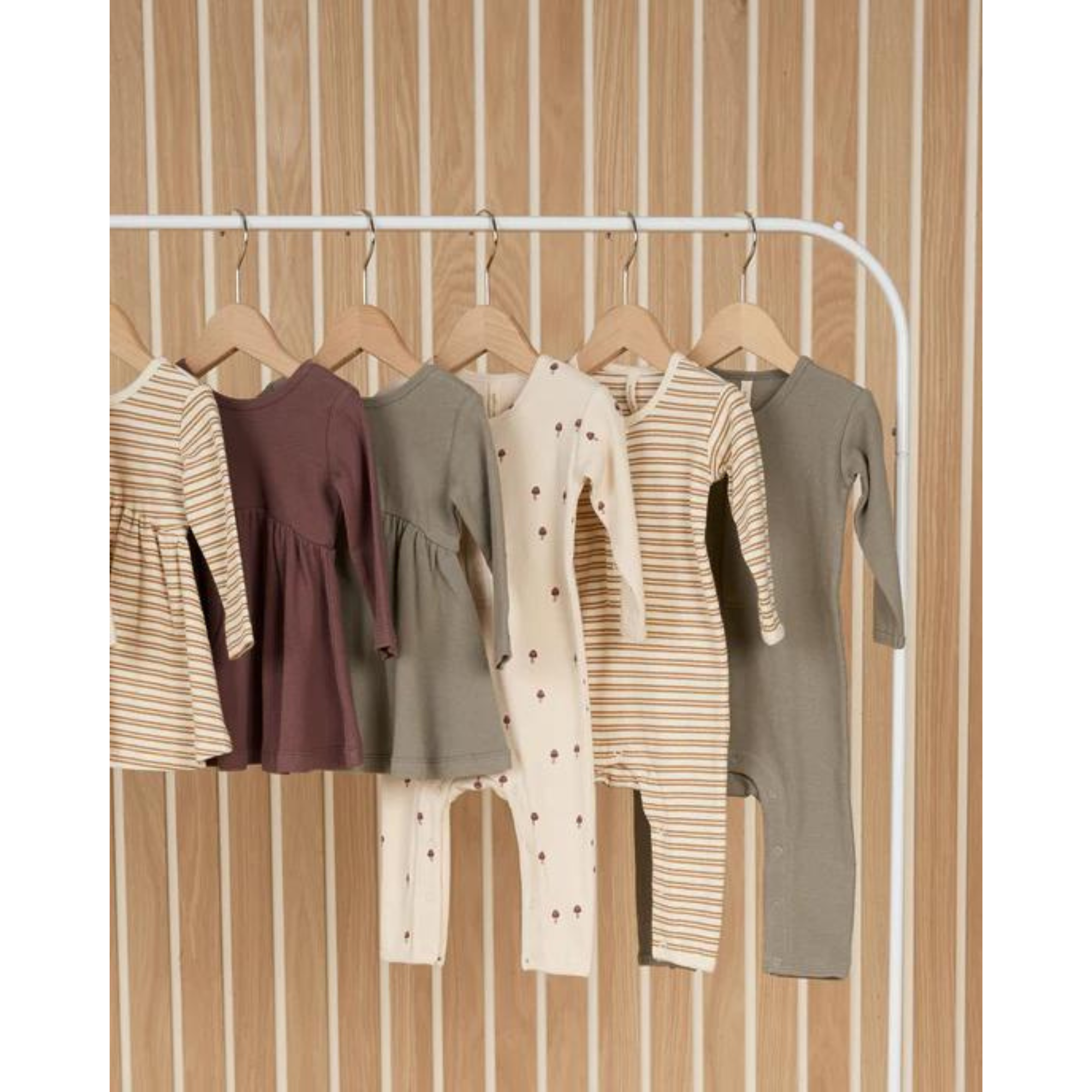 Baby jumpsuit in our stretchy rib knit. Slim fit with added stretch to grow with your baby. Snaps along inseam and down front for easy changing.