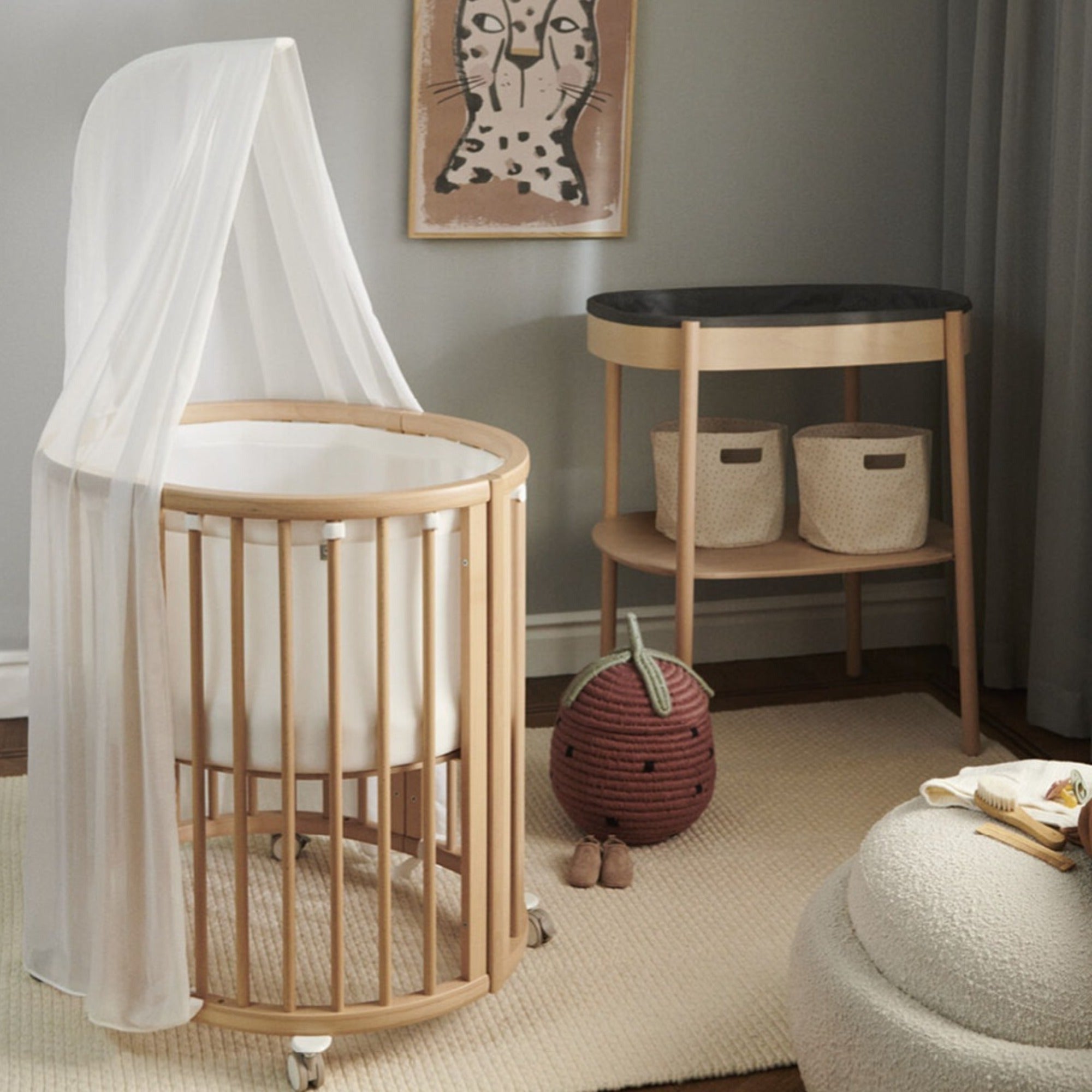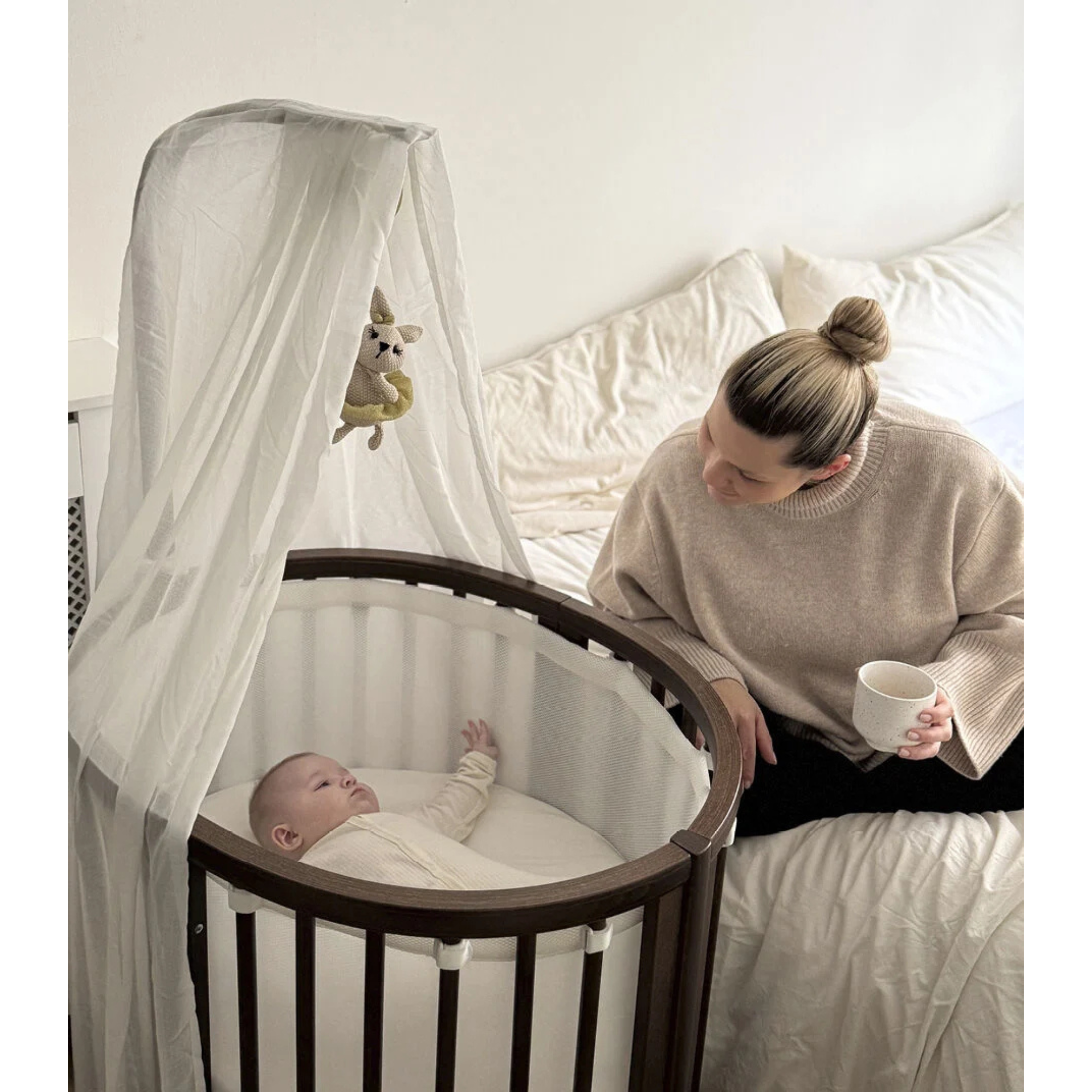 The Stokke® Sleepi™ Mini V3 is the ideal first bed for your newborn. Creating a nest-like environment, it helps baby feel snug and secure. Soft oval design cocoons your baby offering comfort and familiarity for restful sleep and the sweetest of dreams. The drape rod and canopy make it a truly elegant addition to any nursery. Lockable swivel wheels can be used to rock your baby gently to sleep and makes your crib easy to move from room to room. At only 67 cm / 26,4 in inches wide, it’s amazingly space efficient, making it ideal for petite nurseries. The Stokke® Sleepi™ concept has been developed with sound sleep and safety in mind. It is available with a new firm and breathable Sleepi™ mattress which exceeds the highest safety standards. Accessorize with the breathable mesh liner and high-quality textiles.