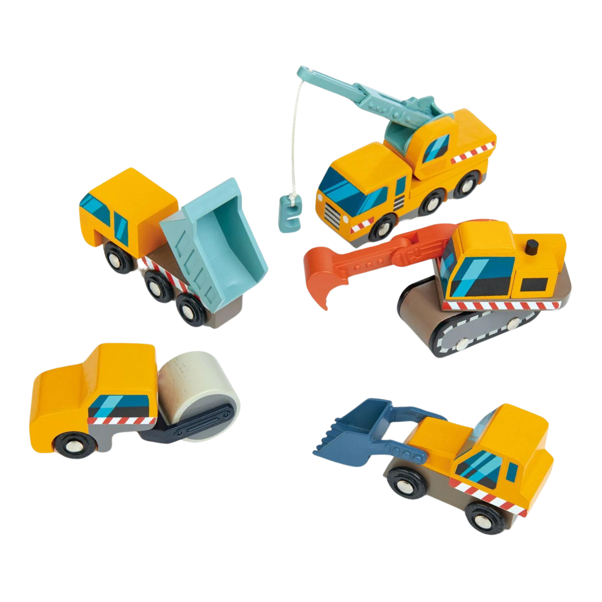 - A collection of construction vehicles, including dump truck, front loader, excavation digger, crane truck, road roller.