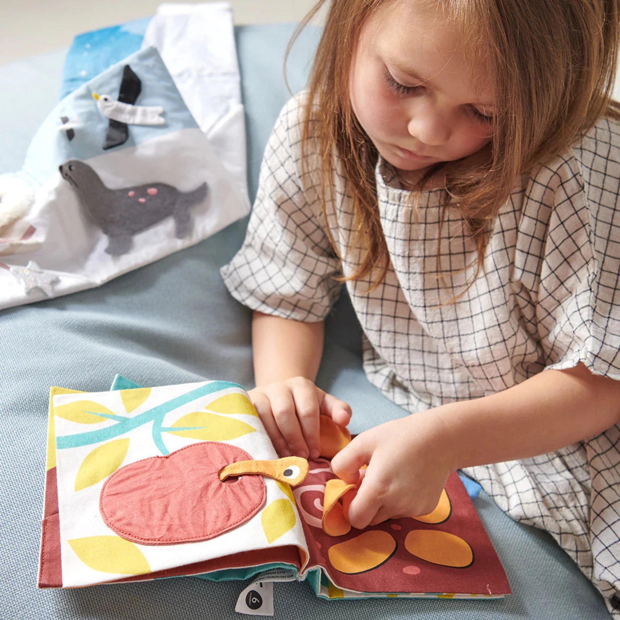 • A garden themed soft fabric activity book complete with hide away flaps, and pockets to keep a baby entertained.